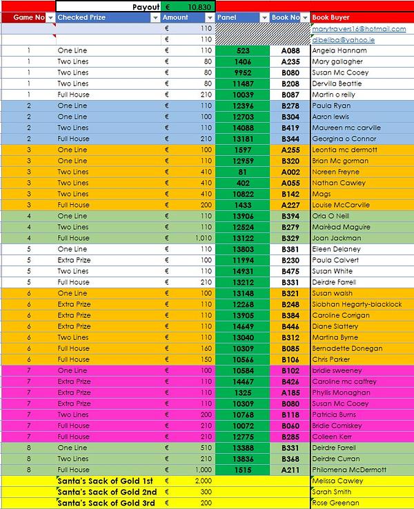 In the 4 week run up to Christmas, 5 books have been drawn each week from the non-winners in that night’s Bingo. Those 20 names were put in a draw and the winners are…